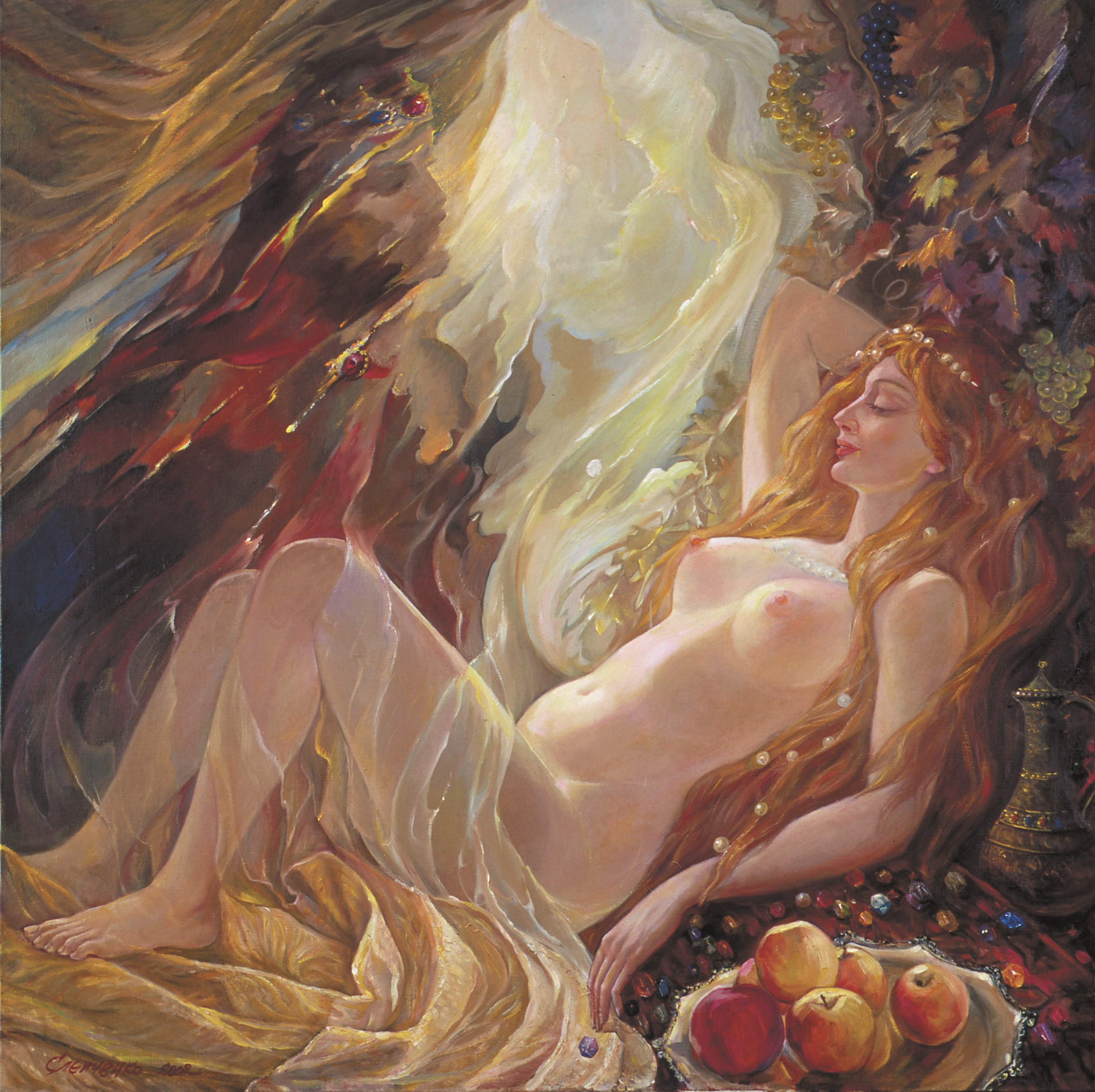 The artist represented Sulamit while sleeping in a vineyard when king Solomon first saw her. In the traditional Christian interpretation of the Song of Songs, Sulamit is an archetypal virgin who represents the Church, Mary and every human soul, while the Beloved One is God. The author presents Solomon as an ideal king and bridegroom who comes to young women in their dreams. (ST)
